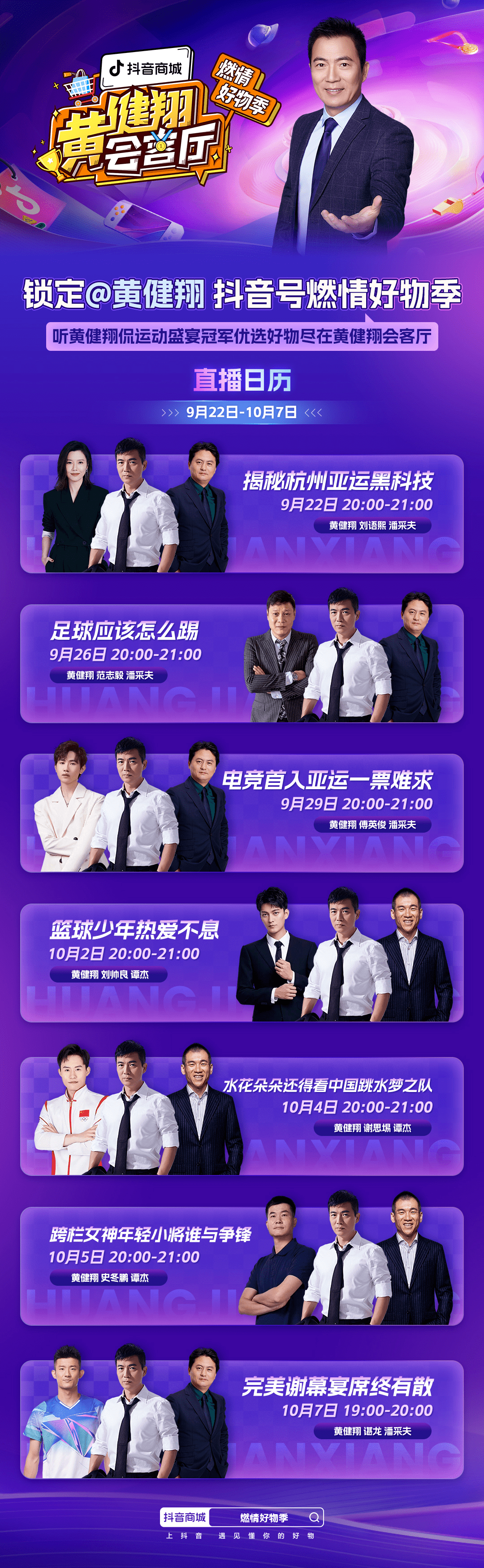 由此,我們看到了抖音商城和抖音體育共同打造的《黃健翔會客廳》:7期節目,貫穿了亞運全周期,總播放量超過6600萬;跟隨賽事節奏,黃健翔攜潘采夫、譚杰,對話專業運動員和體育主持人,不斷奉上妙語辣評,引發全網熱搜12個。