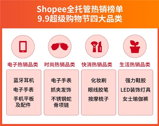 在極具消費(fèi)流量的99大促中,藍(lán)牙耳機(jī)、化妝刷、電子手表、強(qiáng)力鞋膠等成為熱銷跨境品類,Shopee全托管商家的這些單品銷售額較平日直接翻了超10倍。