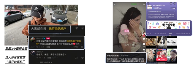 11期間,徠芬運(yùn)用巨量星圖篩選符合消費(fèi)人群偏好的達(dá)人,通過(guò)評(píng)論區(qū)小藍(lán)詞徠芬吹風(fēng)機(jī)設(shè)置,承接搜索流量轉(zhuǎn)化;同時(shí)參與平臺(tái)IP“超會(huì)買(mǎi)企劃增加品牌曝光,以內(nèi)容實(shí)現(xiàn)種草,激發(fā)用戶主動(dòng)搜索。