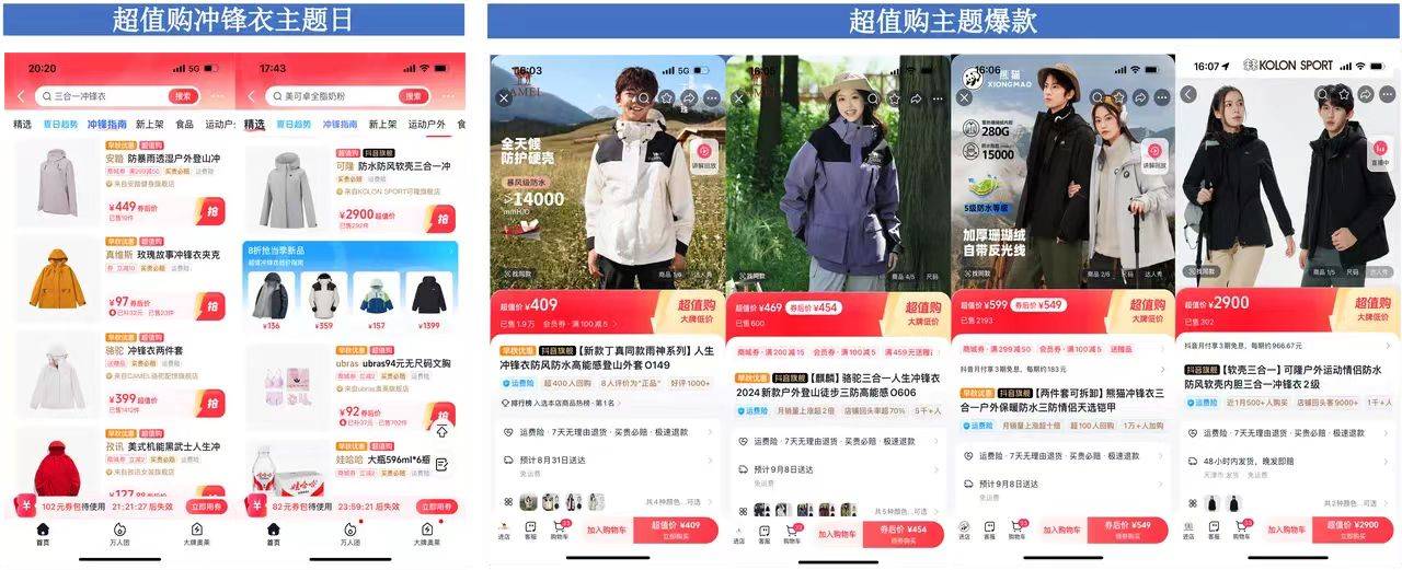 為了幫助品牌促成交易,抖音商城疊加了今日主推、爆款盤點等玩法,它們有效承接了搜索帶來的流量,一大批爆品在活動中誕生。在抖音商城「今日主推」增量實時排行榜,用戶可以一眼了解沖鋒衣品類排名靠前的店鋪,強化優質店鋪心智。在「超值購」板塊,抖音商城上線了“沖鋒指南”選項,盤點了400款優價沖鋒衣,打造超值購品類主題日,把爆品主動選給用戶,誕生了多個百萬/千萬級爆品。